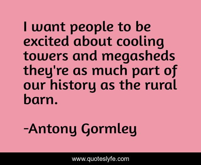 This page presents the quote "I want people to be excited about cooling towers and megasheds they're as much part of our history as the rural barn.". Author of this quote is Antony Gormley. This quote is about people, barn,.