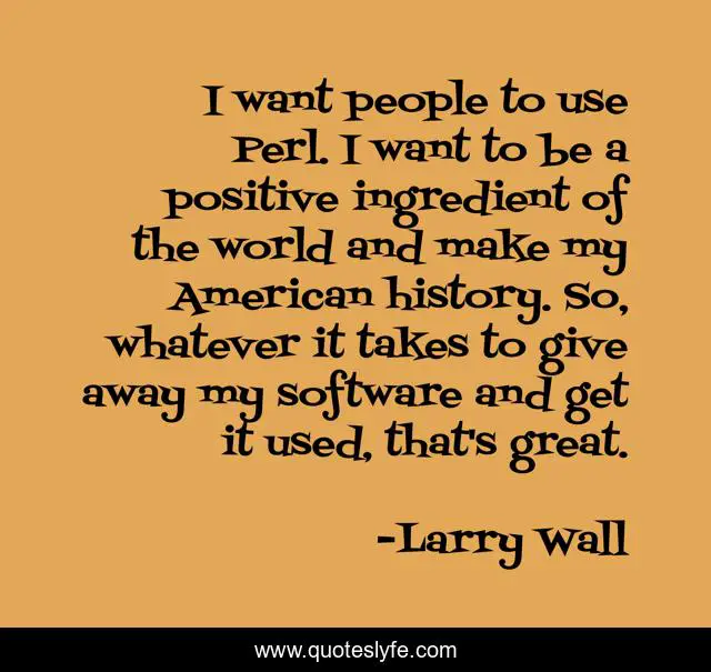 This page presents the quote "I want people to use Perl. I want to be a positive ingredient of the world and make my American history. So, whatever it takes to give away my software and get it used, that's great.". Author of this quote is Larry Wall. This quote is about positive, great, confidence, history,.