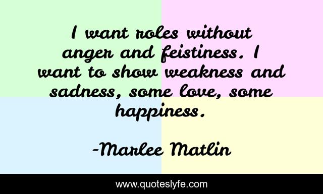 This page presents the quote "I want roles without anger and feistiness. I want to show weakness and sadness, some love, some happiness.". Author of this quote is Marlee Matlin. This quote is about sadness, love, happiness, affection,.