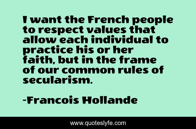 This page presents the quote "I want the French people to respect values that allow each individual to practice his or her faith, but in the frame of our common rules of secularism.". Author of this quote is Francois Hollande. This quote is about rules, faith, people,.