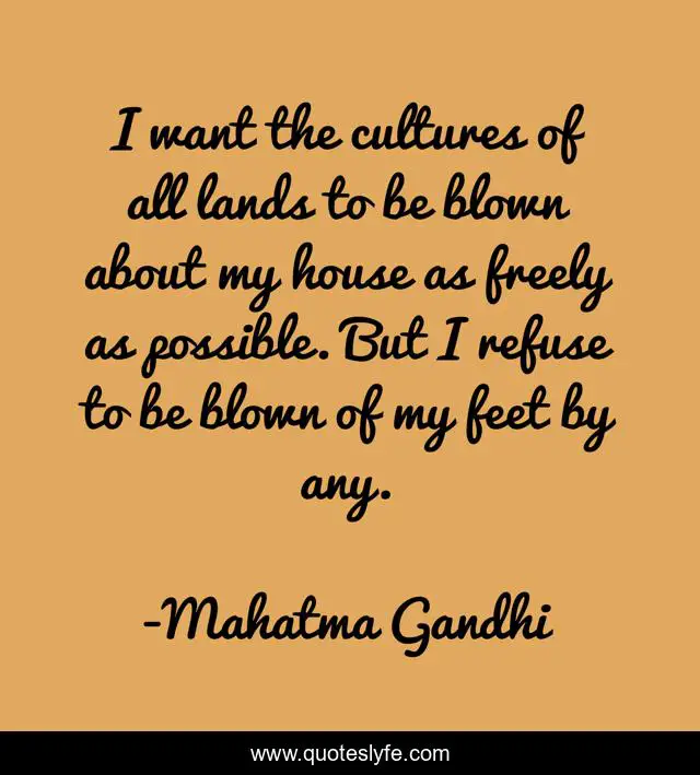 This page presents the quote "I want the cultures of all lands to be blown about my house as freely as possible. But I refuse to be blown of my feet by any.". Author of this quote is Mahatma Gandhi. This quote is about culture, tolerance,.