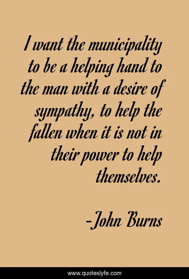 This page presents the quote "I want the municipality to be a helping hand to the man with a desire of sympathy, to help the fallen when it is not in their power to help themselves.". Author of this quote is John Burns. This quote is about sympathy, help, man,.