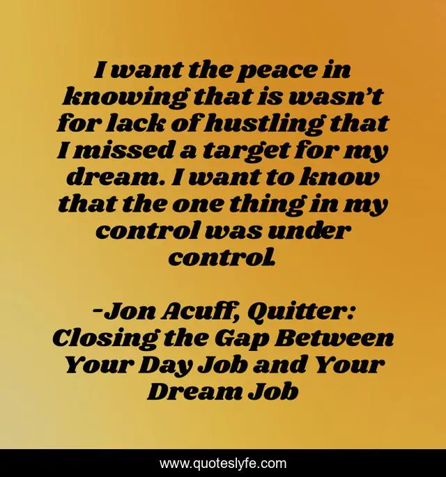 This page presents the quote "I want the peace in knowing that is wasn’t for lack of hustling that I missed a target for my dream. I want to know that the one thing in my control was under control.". Author of this quote is Jon Acuff, Quitter: Closing the Gap Between Your Day Job and Your Dream Job. This quote is about hard-work, hustle,.