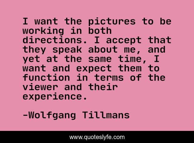 This page presents the quote "I want the pictures to be working in both directions. I accept that they speak about me, and yet at the same time, I want and expect them to function in terms of the viewer and their experience.". Author of this quote is Wolfgang Tillmans. This quote is about me, time, speak,.