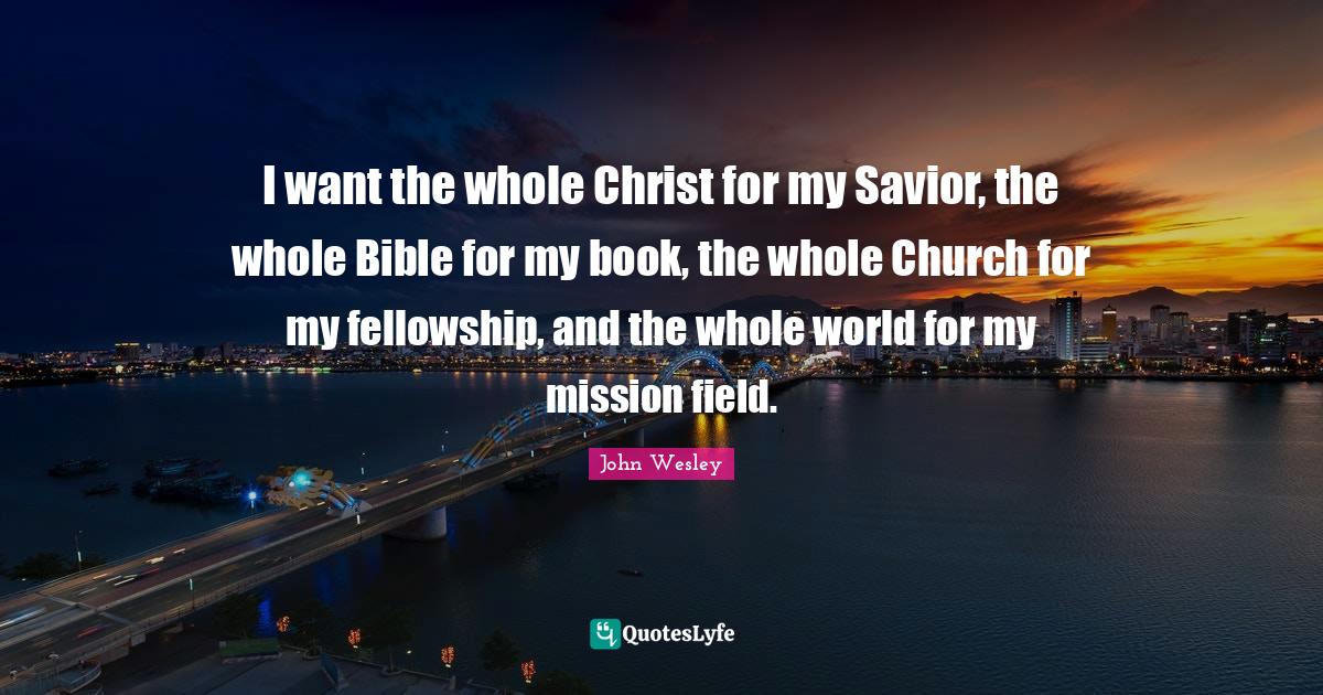 This page presents the quote "I want the whole Christ for my Savior, the whole Bible for my book, the whole Church for my fellowship, and the whole world for my mission field.". Author of this quote is John Wesley. This quote is about church, whole world, christ, savior, fellowship, whole, book, bible,.