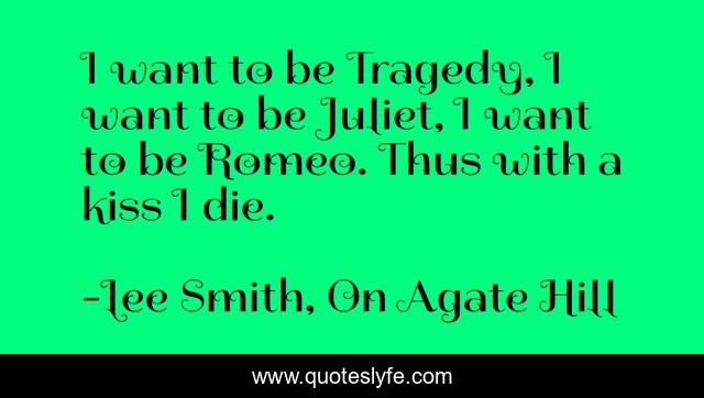 This page presents the quote "I want to be Tragedy, I want to be Juliet, I want to be Romeo. Thus with a kiss I die.". Author of this quote is Lee Smith, On Agate Hill. This quote is about youth, feeling-alive, romeo-and-juliet, feel-everything, on-agate-hill,.