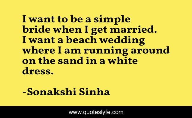 This page presents the quote "I want to be a simple bride when I get married. I want a beach wedding where I am running around on the sand in a white dress.". Author of this quote is Sonakshi Sinha. This quote is about simple, dress,.