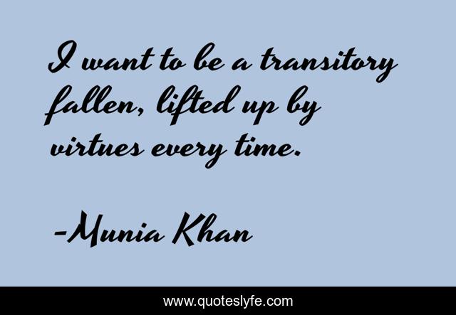 This page presents the quote "I want to be a transitory fallen, lifted up by virtues every time.". Author of this quote is Munia Khan. This quote is about virtues, everytime, transitory, wisdom, virtue, fallen,.