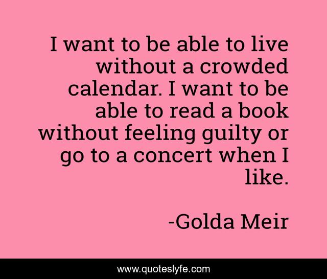 This page presents the quote "I want to be able to live without a crowded calendar. I want to be able to read a book without feeling guilty or go to a concert when I like.". Author of this quote is Golda Meir. .