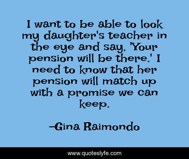 This page presents the quote "I want to be able to look my daughter's teacher in the eye and say, 'Your pension will be there.' I need to know that her pension will match up with a promise we can keep.". Author of this quote is Gina Raimondo. This quote is about daughter, eye,.