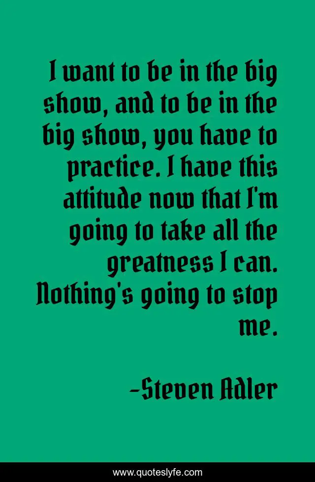 This page presents the quote "I want to be in the big show, and to be in the big show, you have to practice. I have this attitude now that I'm going to take all the greatness I can. Nothing's going to stop me.". Author of this quote is Steven Adler. This quote is about me, practice, greatness,.