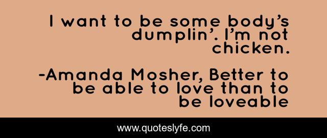 This page presents the quote "I want to be some body’s dumplin’. I’m not chicken.". Author of this quote is Amanda Mosher, Better to be able to love than to be loveable. This quote is about relationships, cute, love, love-and-sayings, commitment, lover, chicken, affection,.