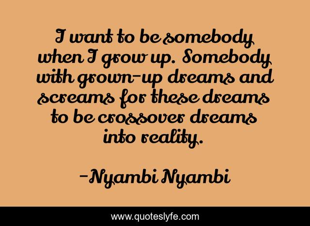 This page presents the quote "I want to be somebody when I grow up. Somebody with grown-up dreams and screams for these dreams to be crossover dreams into reality.". Author of this quote is Nyambi Nyambi. This quote is about grow-up, love-is-love, dreams,.