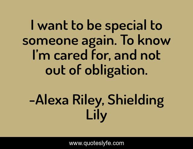 This page presents the quote "I want to be special to someone again. To know I’m cared for, and not out of obligation.". Author of this quote is Alexa Riley, Shielding Lily. This quote is about romance, enthusiasm, erotic-romance, inspirational,.