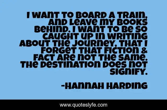 This page presents the quote "I want to board a train, and leave my books behind. I want to be so caught up in writing about the journey, that I forget that fiction & fact are not the same. The destination does not signify.". Author of this quote is Hannah Harding. This quote is about travel-writing, travel, journey, adventure, writing,.
