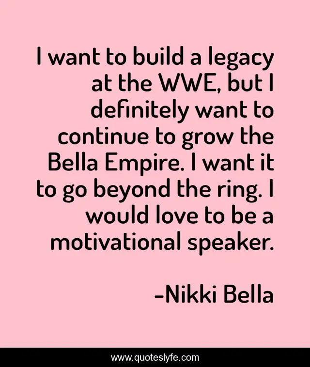 This page presents the quote "I want to build a legacy at the WWE, but I definitely want to continue to grow the Bella Empire. I want it to go beyond the ring. I would love to be a motivational speaker.". Author of this quote is Nikki Bella. This quote is about legacy, love, grow, affection,.