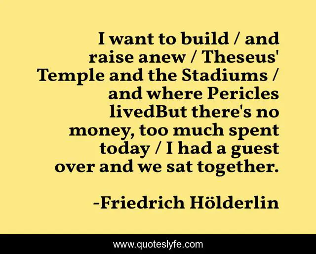 This page presents the quote "I want to build / and raise anew / Theseus' Temple and the Stadiums / and where Pericles livedBut there's no money, too much spent today / I had a guest over and we sat together.". Author of this quote is Friedrich Hölderlin. This quote is about money, theseus, pericles, nostalgia, poem,.