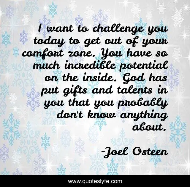 This page presents the quote "I want to challenge you today to get out of your comfort zone. You have so much incredible potential on the inside. God has put gifts and talents in you that you probably don't know anything about.". Author of this quote is Joel Osteen. This quote is about challenge, today,.