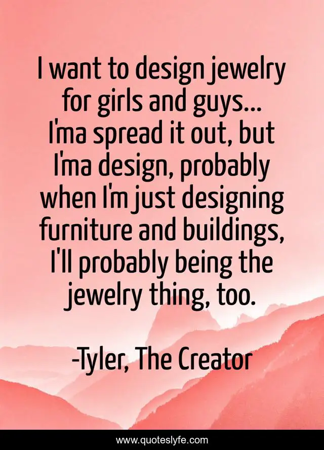 This page presents the quote "I want to design jewelry for girls and guys... I'ma spread it out, but I'ma design, probably when I'm just designing furniture and buildings, I'll probably being the jewelry thing, too.". Author of this quote is Tyler, The Creator. This quote is about jewelry, furniture,.