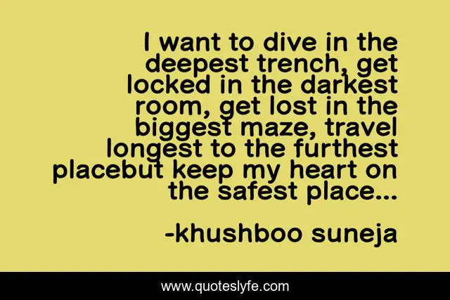 This page presents the quote "I want to dive in the deepest trench, get locked in the darkest room, get lost in the biggest maze, travel longest to the furthest placebut keep my heart on the safest place...". Author of this quote is khushboo suneja. This quote is about heartache, loneliness,.