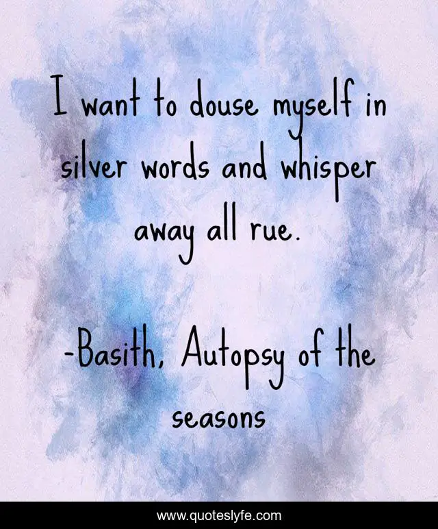 This page presents the quote "I want to douse myself in silver words and whisper away all rue.". Author of this quote is Basith, Autopsy of the seasons. This quote is about monolouge, thoughts,.