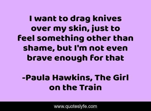 This page presents the quote "I want to drag knives over my skin, just to feel something other than shame, but I'm not even brave enough for that". Author of this quote is Paula Hawkins, The Girl on the Train. This quote is about life, brokenness, hurt, shame, hopeless, escape, feelings, self-doubt,.