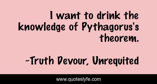 This page presents the quote "I want to drink the knowledge of Pythagorus's theorem.". Author of this quote is Truth Devour, Unrequited. This quote is about faith, love, kindred-spirits, joy, karmic, soul, romance, twin-flames, sated,.