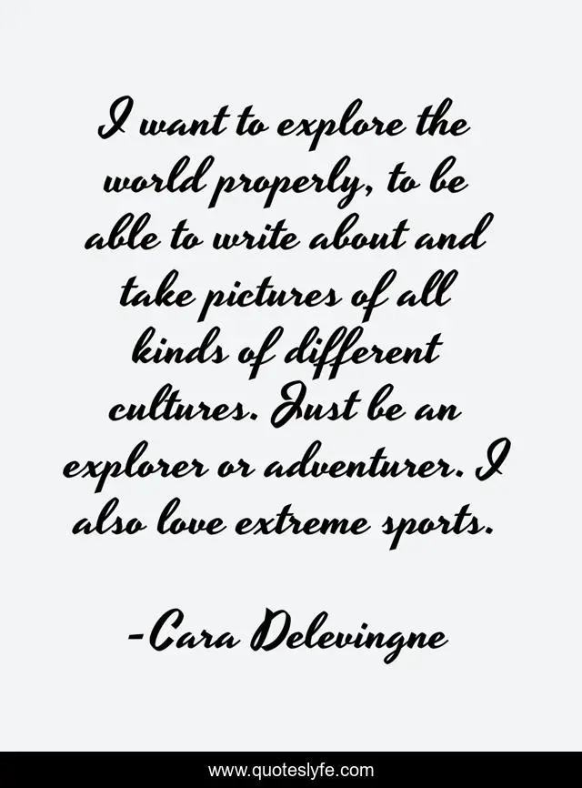This page presents the quote "I want to explore the world properly, to be able to write about and take pictures of all kinds of different cultures. Just be an explorer or adventurer. I also love extreme sports.". Author of this quote is Cara Delevingne. This quote is about world, love, affection,.