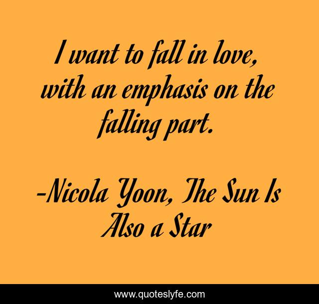 This page presents the quote "I want to fall in love, with an emphasis on the falling part.". Author of this quote is Nicola Yoon, The Sun Is Also a Star. This quote is about love, affection, fall,.