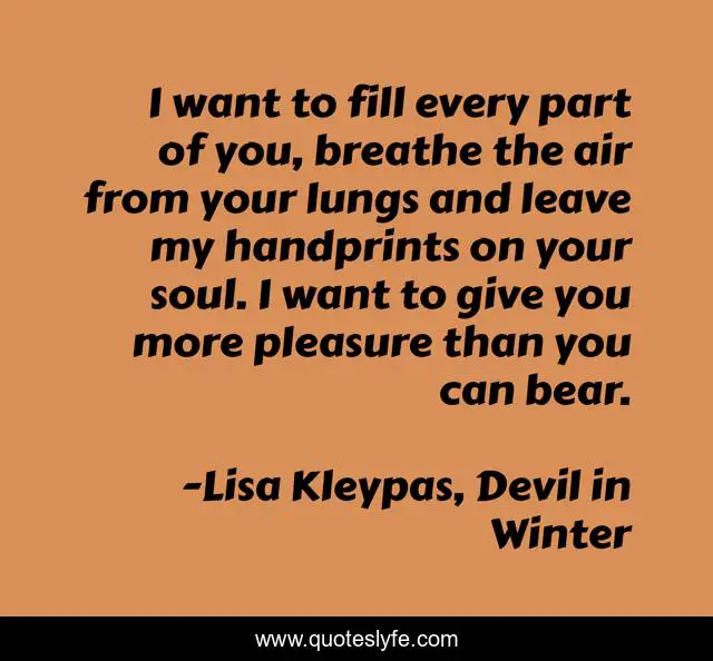 This page presents the quote "I want to fill every part of you, breathe the air from your lungs and leave my handprints on your soul. I want to give you more pleasure than you can bear.". Author of this quote is Lisa Kleypas, Devil in Winter. .