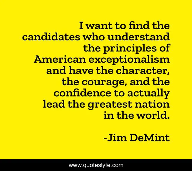 This page presents the quote "I want to find the candidates who understand the principles of American exceptionalism and have the character, the courage, and the confidence to actually lead the greatest nation in the world.". Author of this quote is Jim DeMint. This quote is about world, confidence, character,.