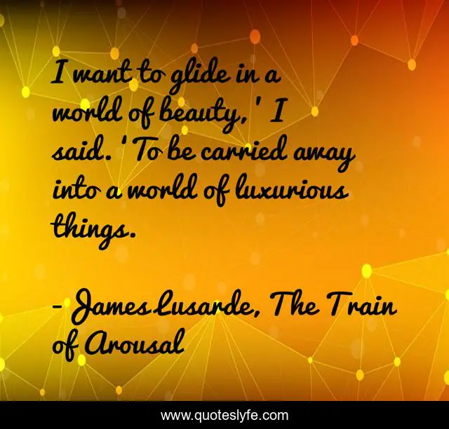 This page presents the quote "I want to glide in a world of beauty, ’ I said. ‘To be carried away into a world of luxurious things.". Author of this quote is James Lusarde, The Train of Arousal. This quote is about erotic-romance, love, beauty, escapism, romance, luxury, men-and-women, erotica, women-s-fiction,.