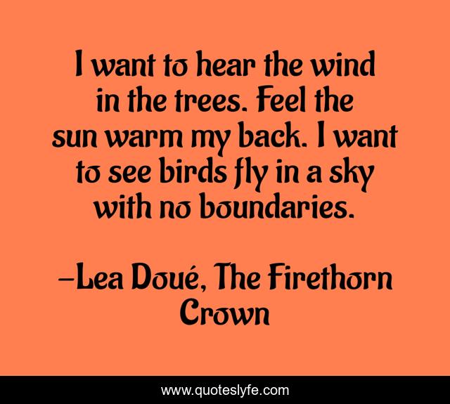 This page presents the quote "I want to hear the wind in the trees. Feel the sun warm my back. I want to see birds fly in a sky with no boundaries.". Author of this quote is Lea Doué, The Firethorn Crown. This quote is about nature, sun, sky, trees, birds, boundaries, hope, warmth, wind,.