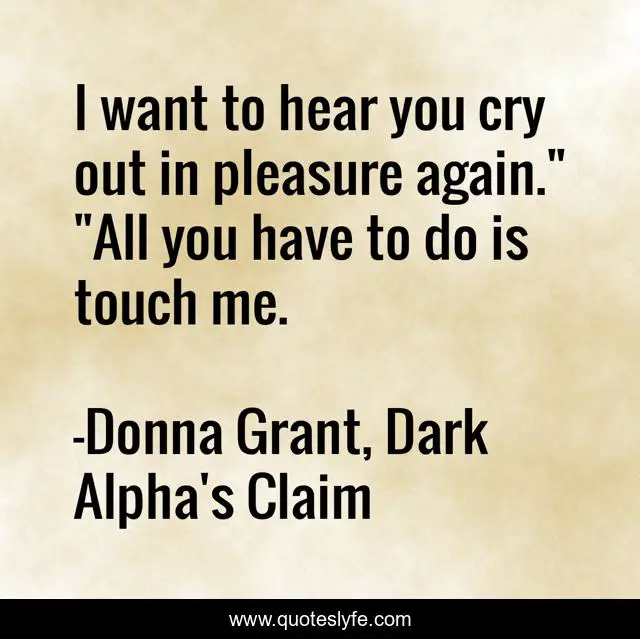 This page presents the quote "I want to hear you cry out in pleasure again." "All you have to do is touch me.". Author of this quote is Donna Grant, Dark Alpha's Claim. This quote is about fantasy-romance, warriors, dark-vs-light, dragons, paranormal-romance, fae,.