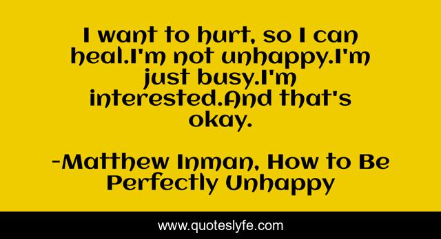 This page presents the quote "I want to hurt, so I can heal.I'm not unhappy.I'm just busy.I'm interested.And that's okay.". Author of this quote is Matthew Inman, How to Be Perfectly Unhappy. This quote is about happy, it-s-ok, happiness, unhappiness,.