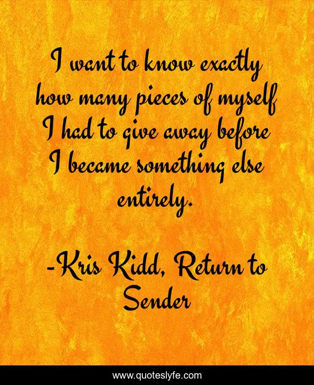 This page presents the quote "I want to know exactly how many pieces of myself I had to give away before I became something else entirely.". Author of this quote is Kris Kidd, Return to Sender. This quote is about self-destruction, self-worth,.