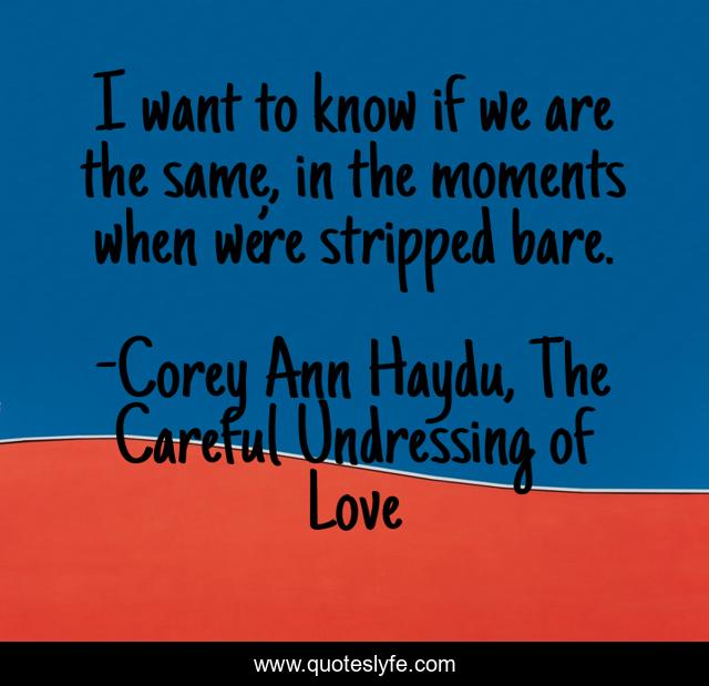 This page presents the quote "I want to know if we are the same, in the moments when we’re stripped bare.". Author of this quote is Corey Ann Haydu, The Careful Undressing of Love. This quote is about living, love, philosophy, life-lessons, humanity, affection,.