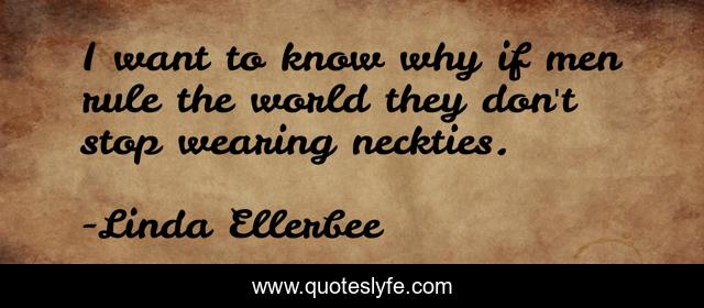 This page presents the quote "I want to know why if men rule the world they don't stop wearing neckties.". Author of this quote is Linda Ellerbee. This quote is about men, women,.