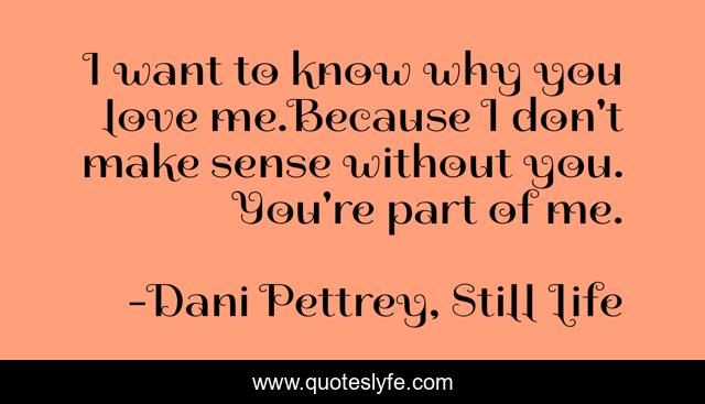 This page presents the quote "I want to know why you love me.Because I don't make sense without you. You're part of me.". Author of this quote is Dani Pettrey, Still Life. This quote is about enthusiasm, inspirational, romantic-suspense,.