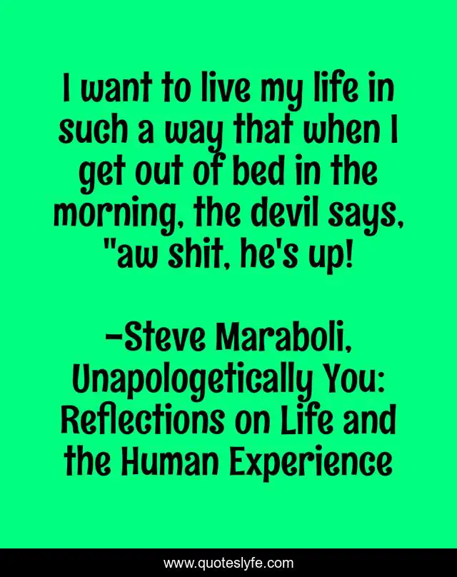 This page presents the quote "I want to live my life in such a way that when I get out of bed in the morning, the devil says, "aw shit, he's up!". Author of this quote is Steve Maraboli, Unapologetically You: Reflections on Life and the Human Experience. This quote is about life, devil, inspirational, positive, motivational, confidence, morning, live, purpose,.