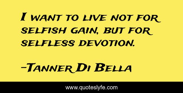 This page presents the quote "I want to live not for selfish gain, but for selfless devotion.". Author of this quote is Tanner Di Bella. This quote is about life, business, success, god, inspirational, enthusiasm,.