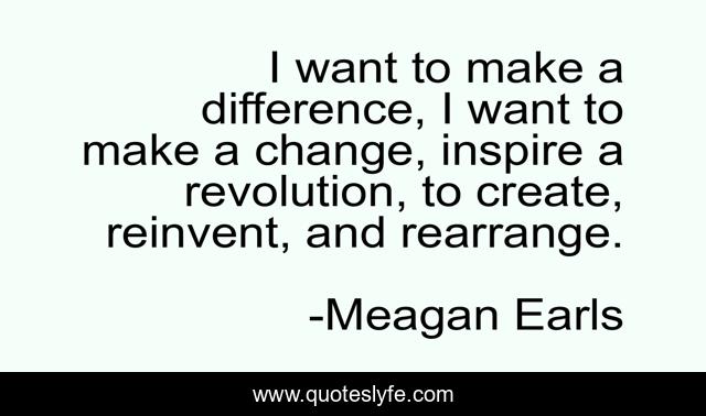 This page presents the quote "I want to make a difference, I want to make a change, inspire a revolution, to create, reinvent, and rearrange.". Author of this quote is Meagan Earls. This quote is about life, revolution, art, goals, inspirational, enthusiasm,.