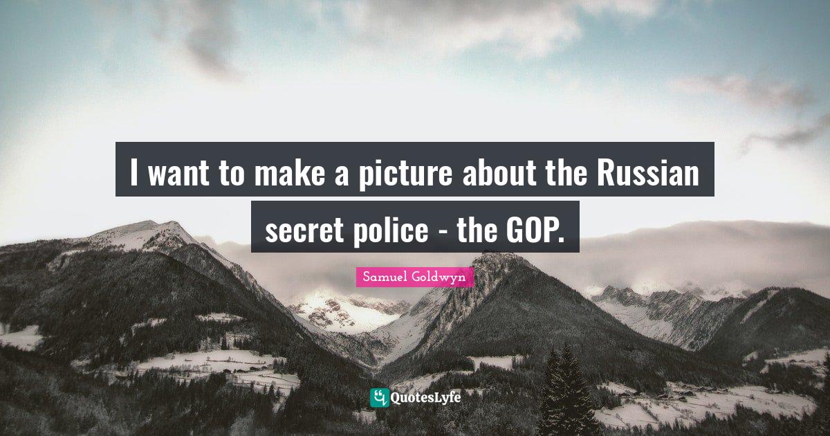 This page presents the quote "I want to make a picture about the Russian secret police - the GOP.". Author of this quote is Samuel Goldwyn. This quote is about witty, secret, funny, gop, police,.