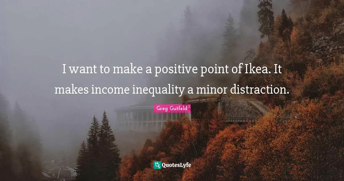 This page presents the quote "I want to make a positive point of Ikea. It makes income inequality a minor distraction.". Author of this quote is Greg Gutfeld. This quote is about income, positive, ikea, income inequality, distraction,.