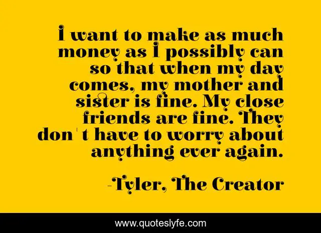 This page presents the quote "I want to make as much money as I possibly can so that when my day comes, my mother and sister is fine. My close friends are fine. They don't have to worry about anything ever again.". Author of this quote is Tyler, The Creator. This quote is about sister, friends, mother,.