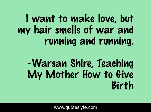 This page presents the quote "I want to make love, but my hair smells of war and running and running.". Author of this quote is Warsan Shire, Teaching My Mother How to Give Birth. This quote is about love, war, affection,.
