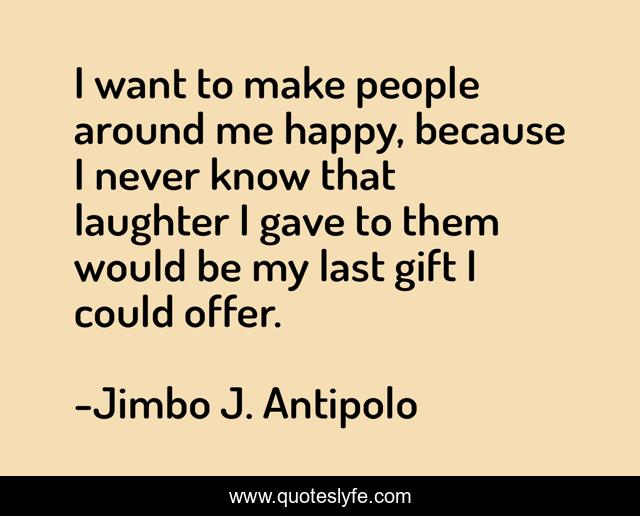 This page presents the quote "I want to make people around me happy, because I never know that laughter I gave to them would be my last gift I could offer.". Author of this quote is Jimbo J. Antipolo. This quote is about memories, laughter, gift, happiness,.
