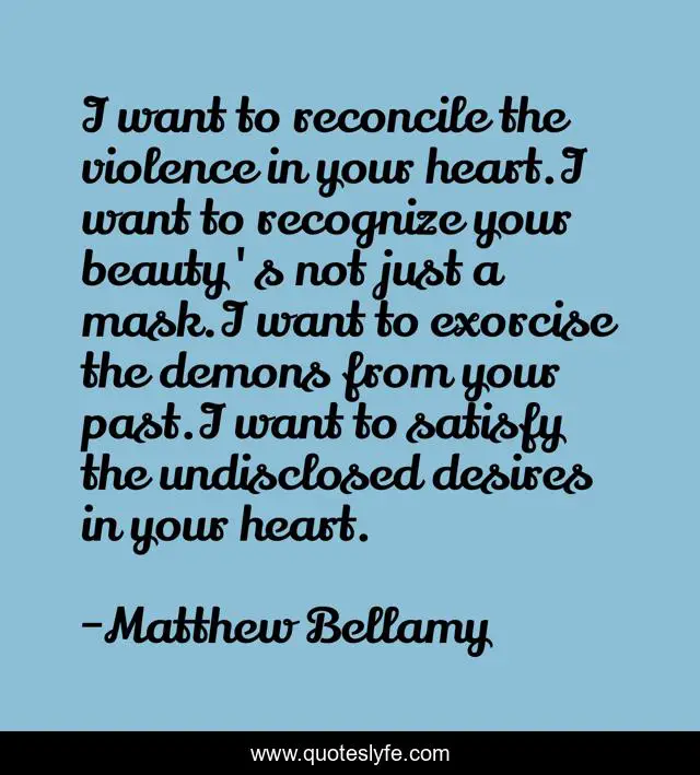 This page presents the quote "I want to reconcile the violence in your heart.I want to recognize your beauty's not just a mask.I want to exorcise the demons from your past.I want to satisfy the undisclosed desires in your heart.". Author of this quote is Matthew Bellamy. This quote is about love, music, hope, affection,.