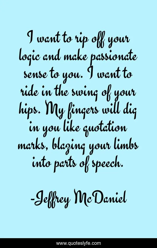 This page presents the quote "I want to rip off your logic and make passionate sense to you. I want to ride in the swing of your hips. My fingers will dig in you like quotation marks, blazing your limbs into parts of speech.". Author of this quote is Jeffrey McDaniel. This quote is about poem, the-jerk,.