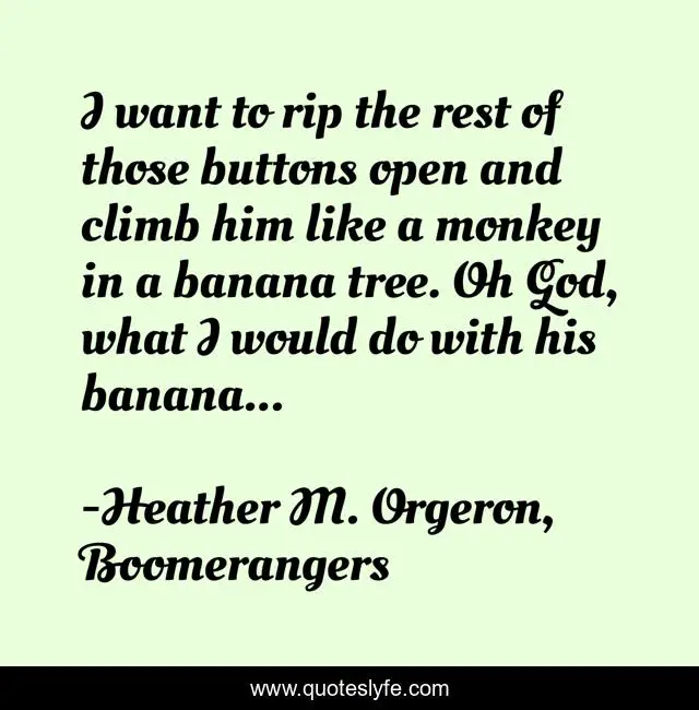 This page presents the quote "I want to rip the rest of those buttons open and climb him like a monkey in a banana tree. Oh God, what I would do with his banana...". Author of this quote is Heather M. Orgeron, Boomerangers. This quote is about romance, funny, comedy, romantic-comedy,.